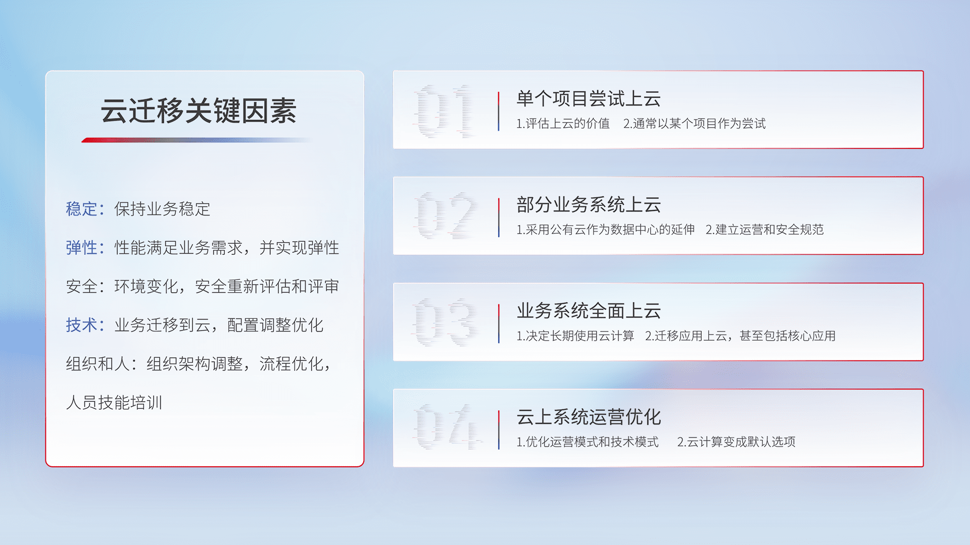 结合实际业务,,从规划设计、、云平台选型、、、、云原生改造、、、数据迁移、、集成交付,,迁移全过程为客户识别最佳上云路径,,做好风险识别管理,,,设计网络架构、、、身份权限、、、安全审计合规、、、、操作审计、、、、日志审计、、、、监控告警策略、、、多站点容灾设计等,,对云上基础设施进行整体规划,,,提升IT治理水平,,,以满足弹性、、高可用、、、高性能的需求。。。。